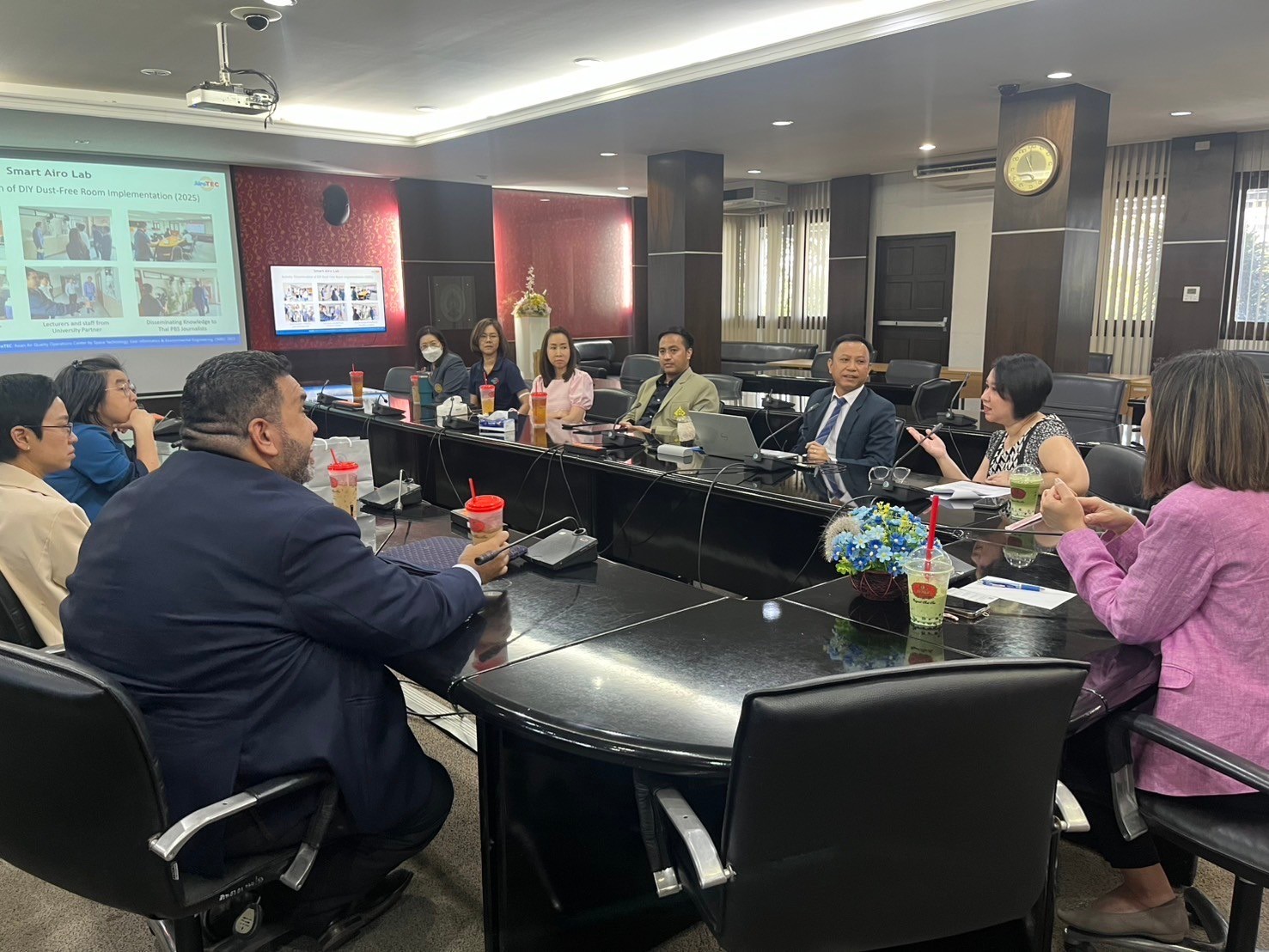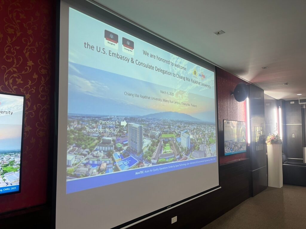 การประชุมหารือระหว่าง CMRU และตัวแทนสถานเอกอัครราชทูตสหรัฐฯ คณะผู้บริหารของมหาวิทยาลัยราชภัฏเชียงใหม่ นำโดย ผศ.ดร.ดุษฎี รังษีชัชวาล ผู้ช่วยอธิการบดี, อ.ดร.วรสุดา วัฒนวงศ์ ผู้อำนวยการสำนักงานวิเทศสัมพันธ์ โดย อ.ดร.รัชพล สัมพุทธานนท์ ผู้อำนวยการ AiroTEC ได้นำเสนอโครงการความร่วมมือกับประเทศสหรัฐอเมริกา ได้แก่ การติดตั้งเครื่องมือ Pandora Spectrometer เพื่อวัดองค์ประกอบของบรรยากาศ, การใช้ประโยชน์จากข้อมูลดาวเทียม GEMS และดาวเทียมอื่น ๆ การร่วมสำรวจบรรยากาศกับองค์การนาซ่าด้วยเครื่องบิน DC-8 ซึ่งช่วยให้เข้าใจการเคลื่อนที่ของมลพิษทางอากาศในแนวราบและแนวดิ่งภายในแอ่งเชียงใหม่-ลำพูน ได้มากขึ้น